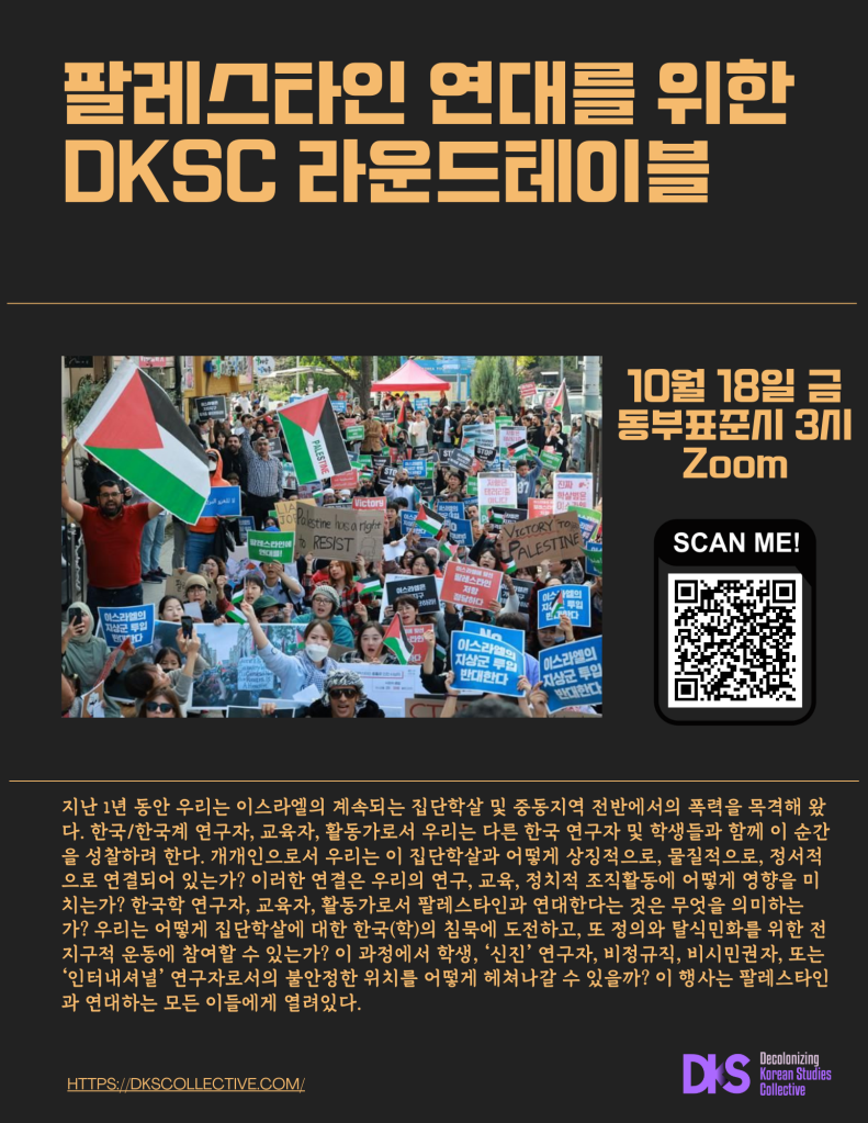 For the past year, we have witnessed Israel’s ongoing genocide in Gaza and escalating violence across the region. As scholars, educators, and organizers from Korea and the Korean diaspora, we invite Korean studies scholars and students to come together and reflect on this moment. How are we, as individuals, connected to this genocide—symbolically, materially, and affectively? How do these connections shape and reshape our work, whether in scholarship, teaching, or political organizing? What does it mean to stand in solidarity with Palestine as Korean studies scholars, educators, and organizers? How can we challenge the widespread silence within Korean studies, as well as Korean and Korean diasporic communities, and contribute to the broader global movements for justice and decolonization, all while navigating our own precarious positions as early-career, non-tenured, non-citizen, or “international” scholars? Members of the DKSC will serve as panelists to share personal reflections on these questions. We welcome all those in solidarity with Palestine to join us in this collective, critical reflection.