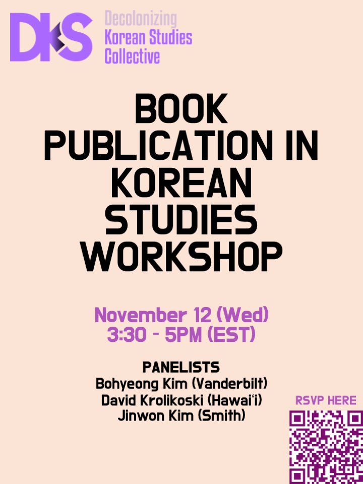 The Decolonizing Korean Studies Collective (DKSC) presents a professionalization workshop on book publication in Korean Studies on November 12 (Wed), from 3:30-5PM EST. Three scholars (Bohyeong Kim, David Krolikoski, and Jinwon Kim) will share their experiences publishing (forthcoming) monographs with different academic presses and across diverse disciplines. The panel will discuss strategies for transforming a dissertation into a book, navigating editorial and disciplinary expectations, and considering the role of mentorship and institutional support in the process, within the context of Korean studies in English-language scholarly publishing. The workshop will be conducted in English and Korean, with partial translation available in the chat.